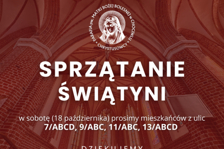 Dziękujemy za ostatnie sprzątanie świątyni. W przyszłym tygodniu zapraszamy serdecznie mieszkańców ulicy Dąbrowskiego 7/ABCD, 9/ABC, 11/ABC, 13/ABCD Rozpoczynamy o godz. 9.30.