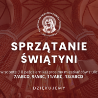 Dziękujemy za ostatnie sprzątanie świątyni. W przyszłym tygodniu zapraszamy serdecznie mieszkańców ulicy Dąbrowskiego 7/ABCD, 9/ABC, 11/ABC, 13/ABCD Rozpoczynamy o godz. 9.30.