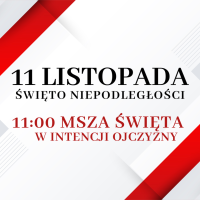 Zapraszamy gorąco do wielkiej i wspólnej modlitwy za naszą Ojczyznę, w dzień dla na Polaków bardzo ważny – 11 listopada w Święto Niepodległości. O godz. 11:00 zostanie odprawiona uroczysta Msza Święta w intencji Ojczyzny. Weźmy ze sobą, na tę Mszę, flagi biało-czerwone, wymowny znak naszej miłości do Polski. Po Mszy Świętej, o godz. 12:00, złożenie kwiatów i zapalenie zniczy przed Pomnikiem Armii Wojska Polskiego oraz przed pomnikami Sybiraków.