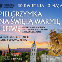 Zapraszamy serdecznie na czterodniową PIELGRZYMKĘ NA ŚWIĘTĄ WARMIĘ I LITWĘ (m.in. Gietrzwałd, Wilno) w dniach 30 kwietnia – 3 maja. Koszt pielgrzymki to 700 zł + 130 €. Zapisy i szczegóły w zakrystii lub biurze.