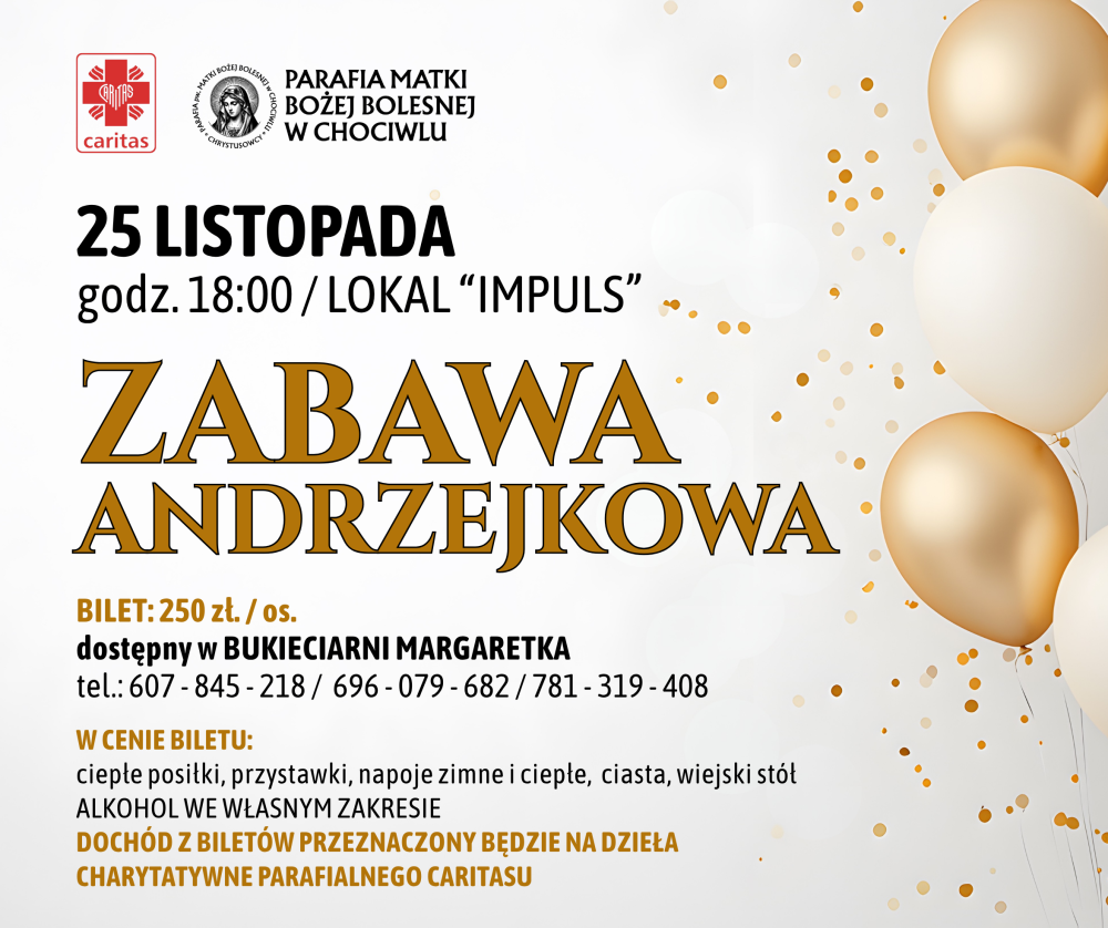 Zapraszamy na tegoroczną ZABAWĘ ANDRZEJKOWĄ, która odbędzie się w sobotę (22 listopada) o godz. 18:00 w IMPULSIE. Bilety (250 zł.) w bukieciarni MARGARETKA.