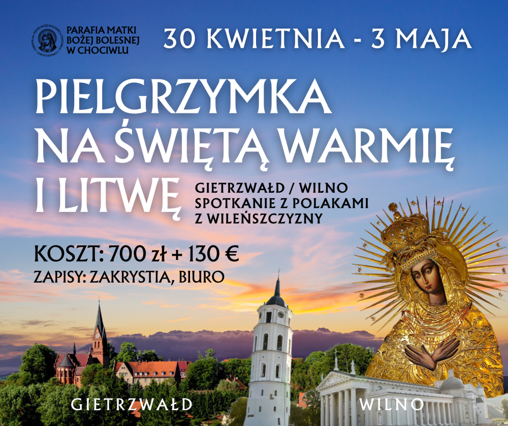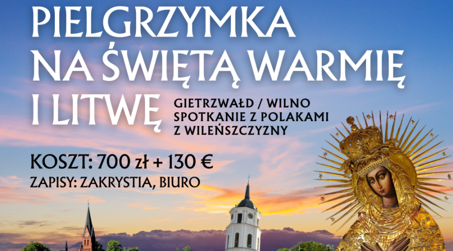 Zapraszamy serdecznie na czterodniową PIELGRZYMKĘ NA ŚWIĘTĄ WARMIĘ I LITWĘ (m.in. Gietrzwałd, Wilno) w dniach 30 kwietnia – 3 maja. Koszt pielgrzymki to 700 zł + 130 €. Zapisy i szczegóły w zakrystii lub biurze.