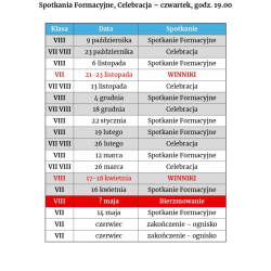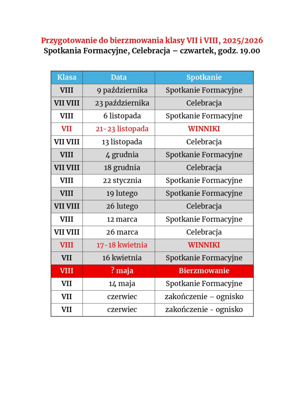 Grafik spotkań 2025/26 dla kandydatów do Sakramentu bierzmowania: patrz tabela / zdjęcie powyżej