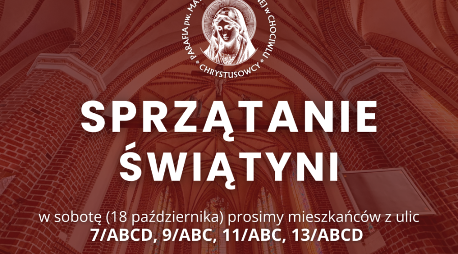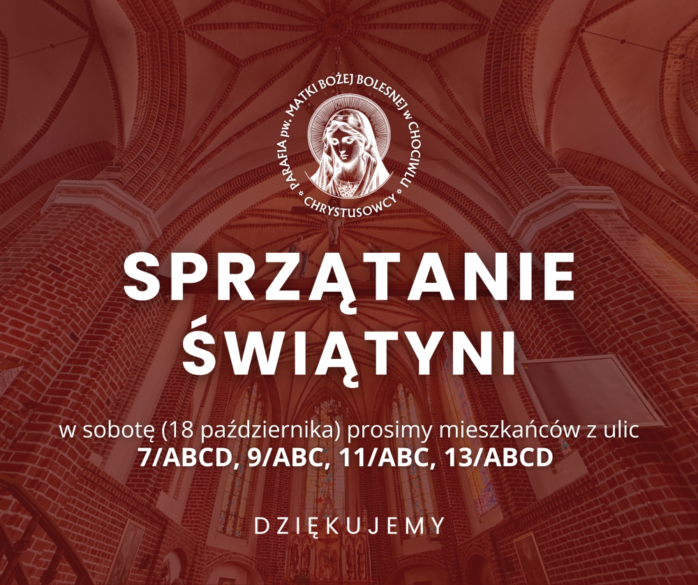 Dziękujemy za ostatnie sprzątanie świątyni. W przyszłym tygodniu zapraszamy serdecznie mieszkańców ulicy Dąbrowskiego 7/ABCD, 9/ABC, 11/ABC, 13/ABCD Rozpoczynamy o godz. 9.30.