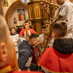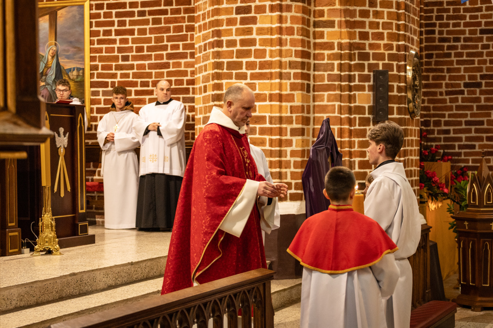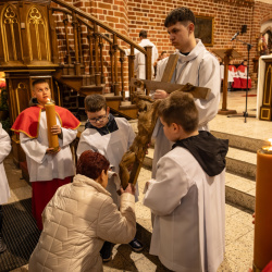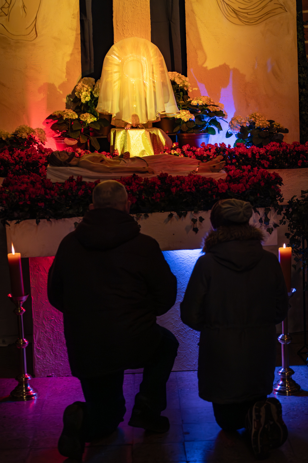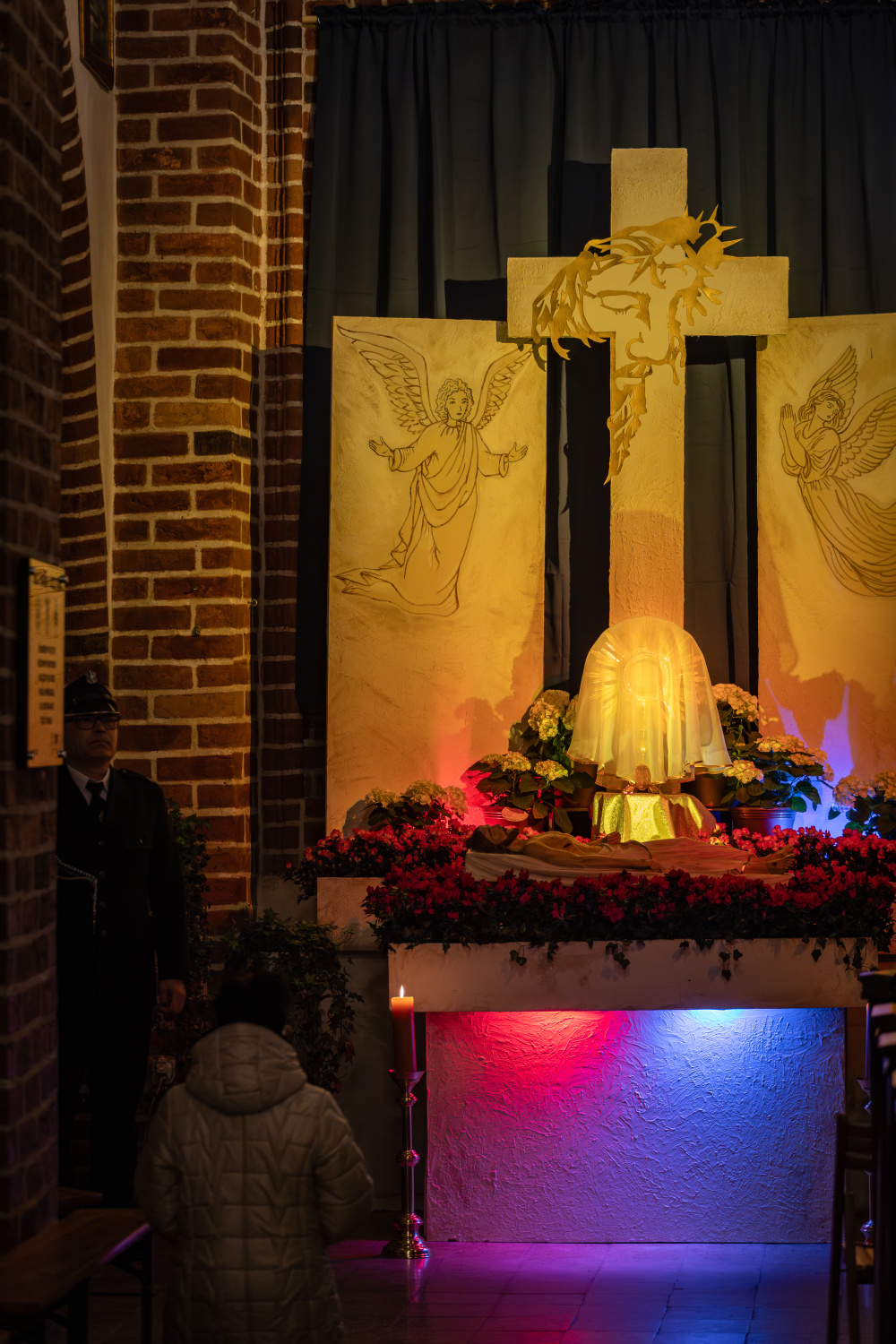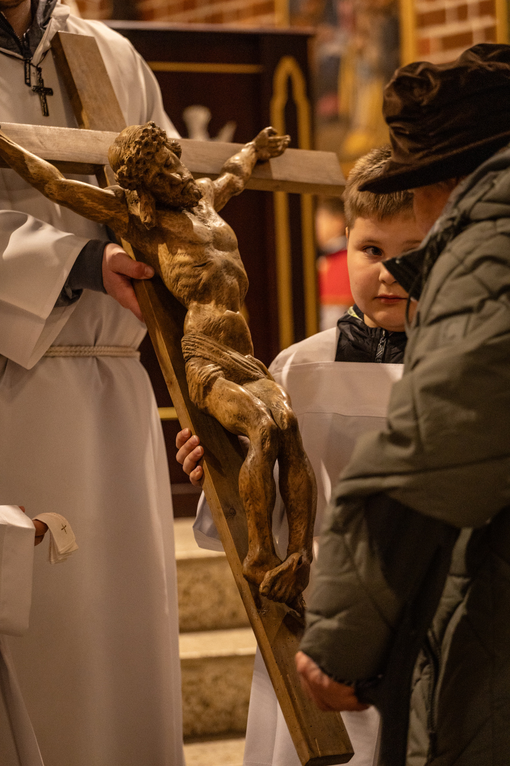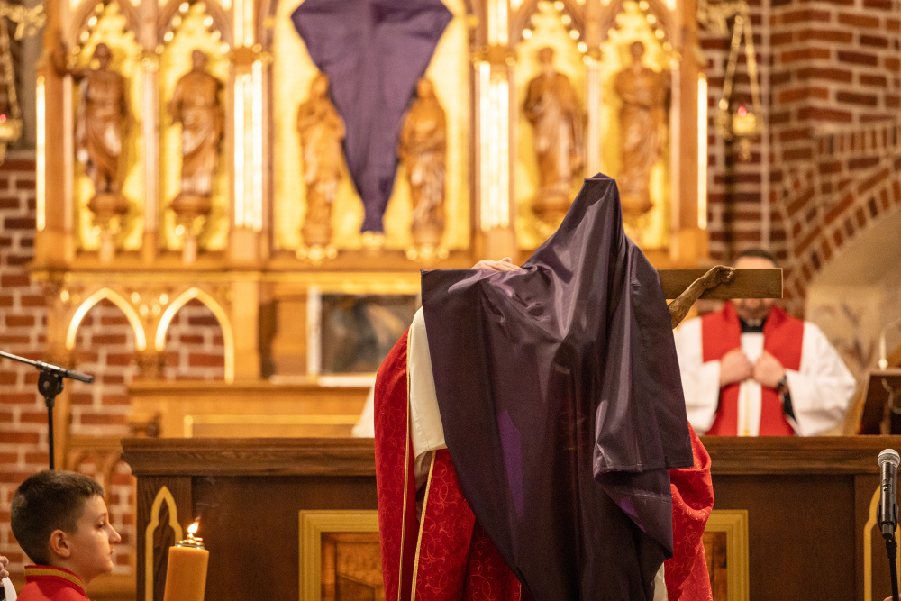 Wielki Piątek (3 kwietnia) był dniem postu i modlitwy. Przez cały dzień nasi parafianie gromadzili się na modlitwę przy ciemnicy, aby w ciszy odkrywać swoje serce przed Bogiem. Wiele osób przystąpiło do Sakramentu Pokuty i Pojednania. O godz. 09:00 i 15:00 odbyły się nabożeństwa Drogi Krzyżowej. Liturgia Męki Pańskiej, której przewodniczył Proboszcz ks. Zbigniew, rozpoczęła się pod wieczór, o godz. 18:00.