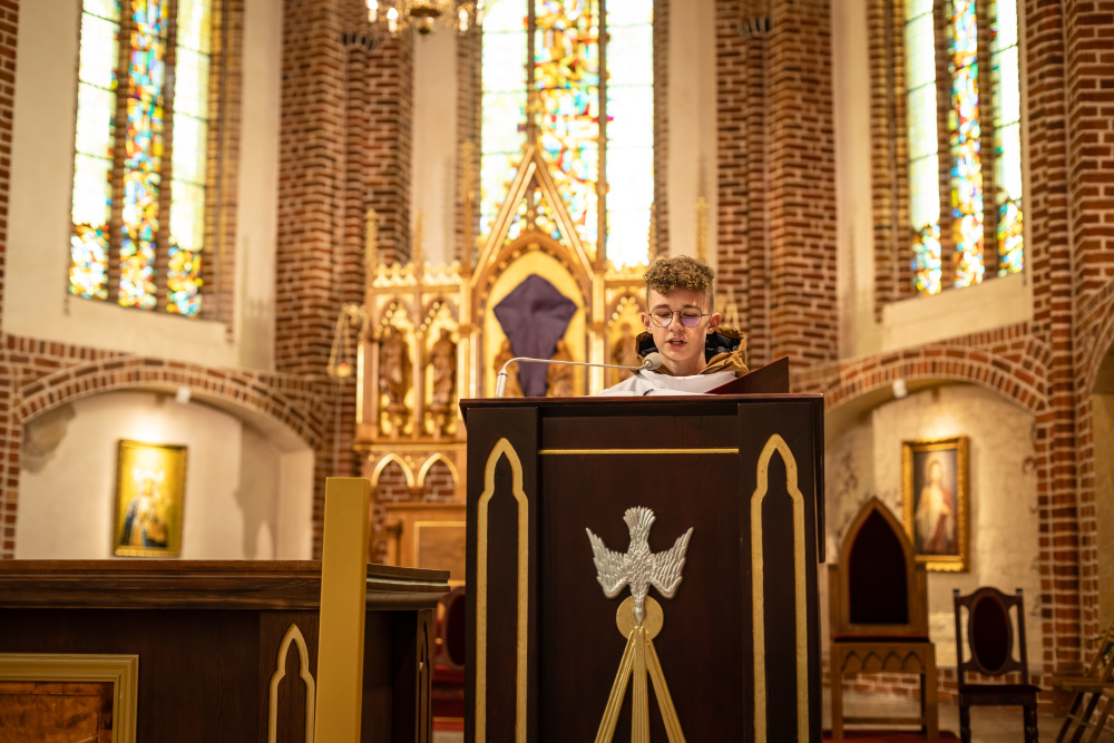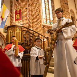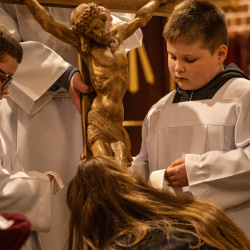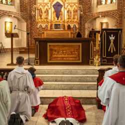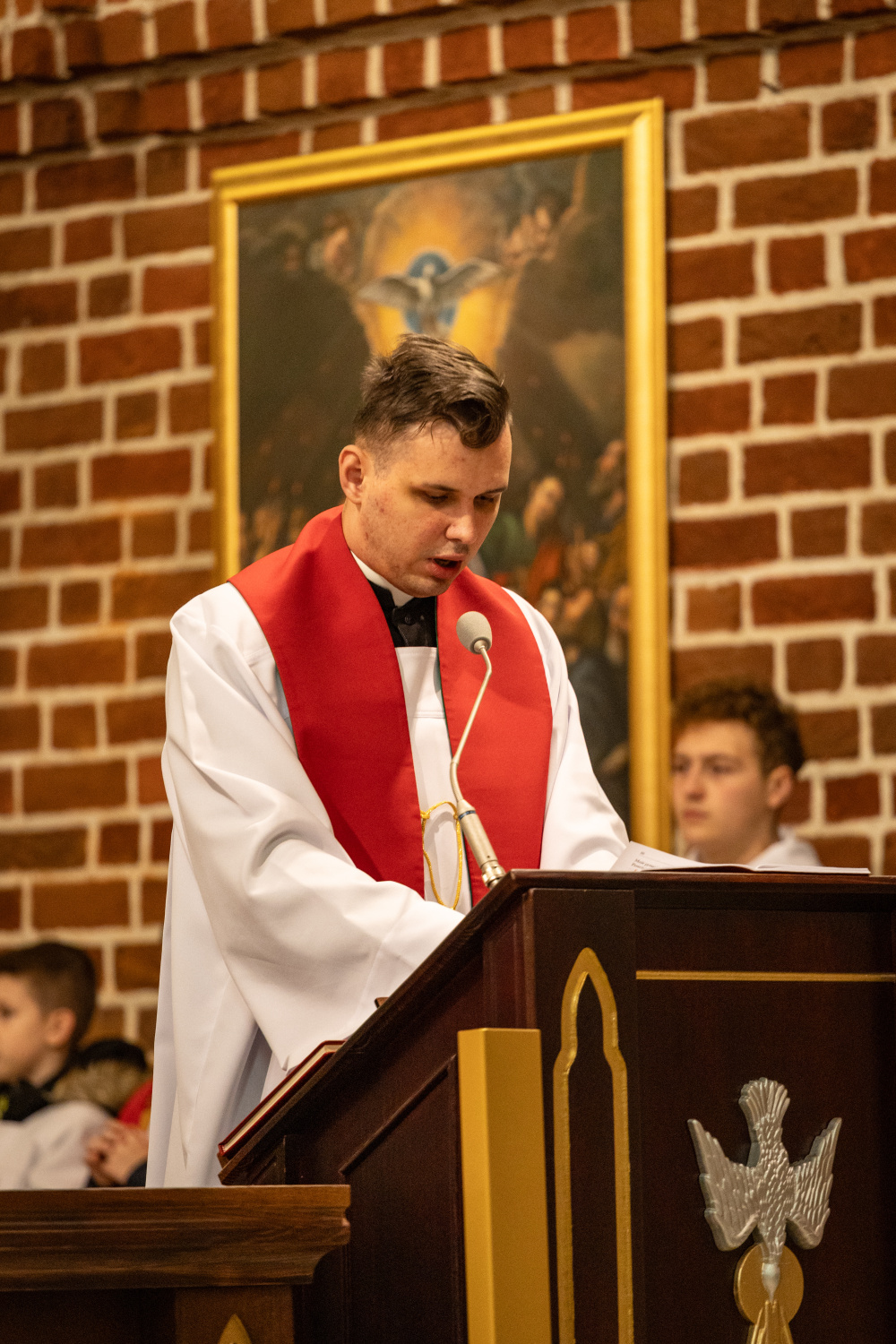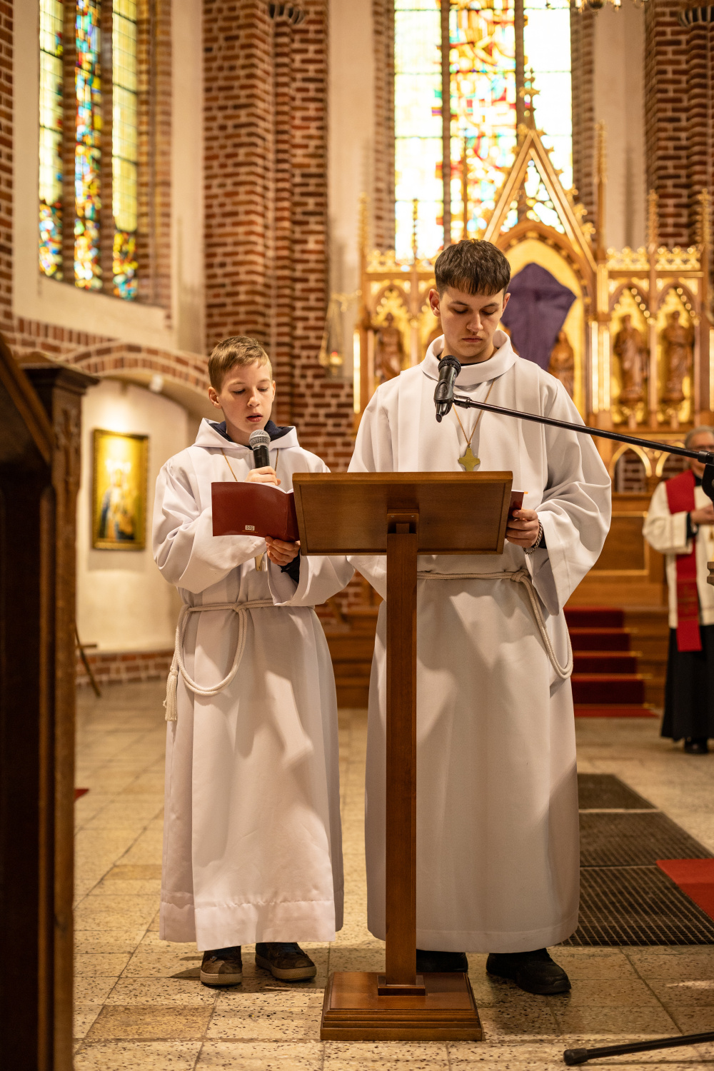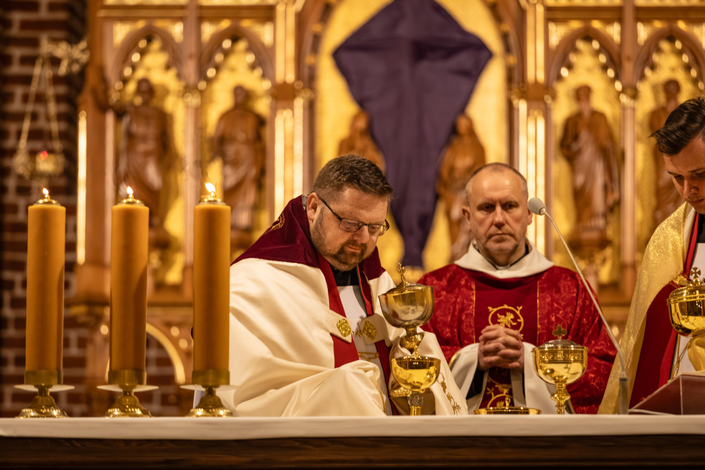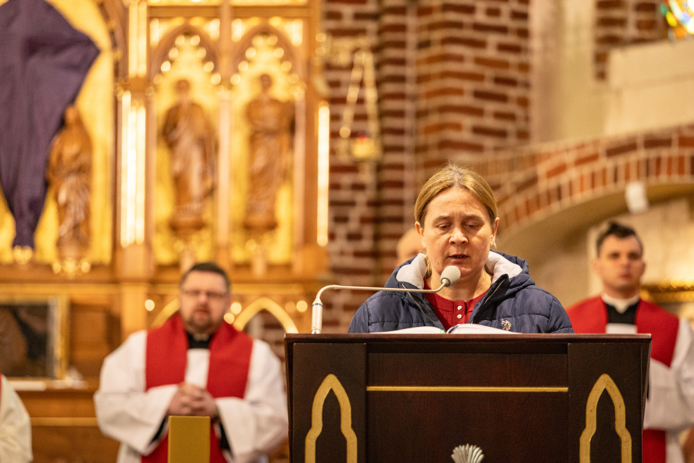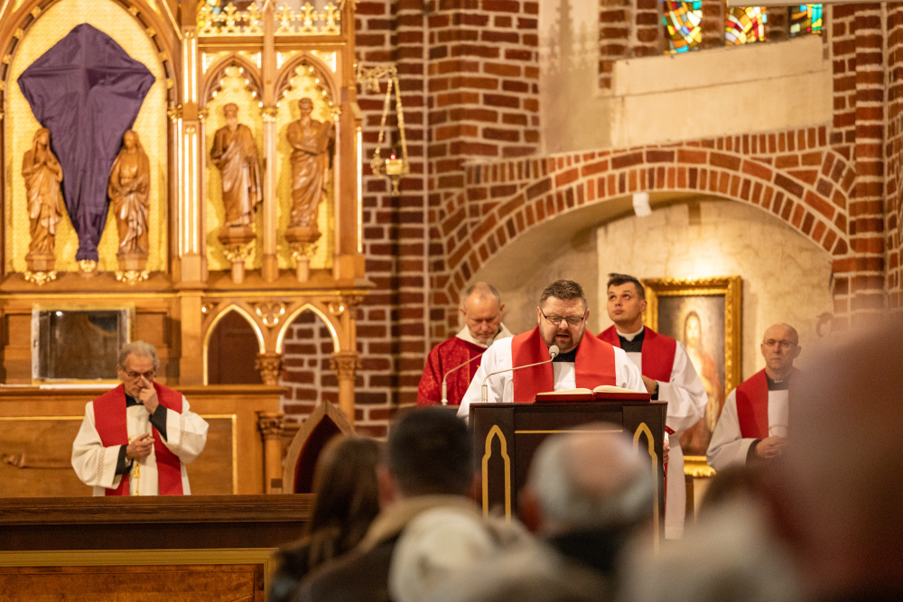 Wielki Piątek (3 kwietnia) był dniem postu i modlitwy. Przez cały dzień nasi parafianie gromadzili się na modlitwę przy ciemnicy, aby w ciszy odkrywać swoje serce przed Bogiem. Wiele osób przystąpiło do Sakramentu Pokuty i Pojednania. O godz. 09:00 i 15:00 odbyły się nabożeństwa Drogi Krzyżowej. Liturgia Męki Pańskiej, której przewodniczył Proboszcz ks. Zbigniew, rozpoczęła się pod wieczór, o godz. 18:00.