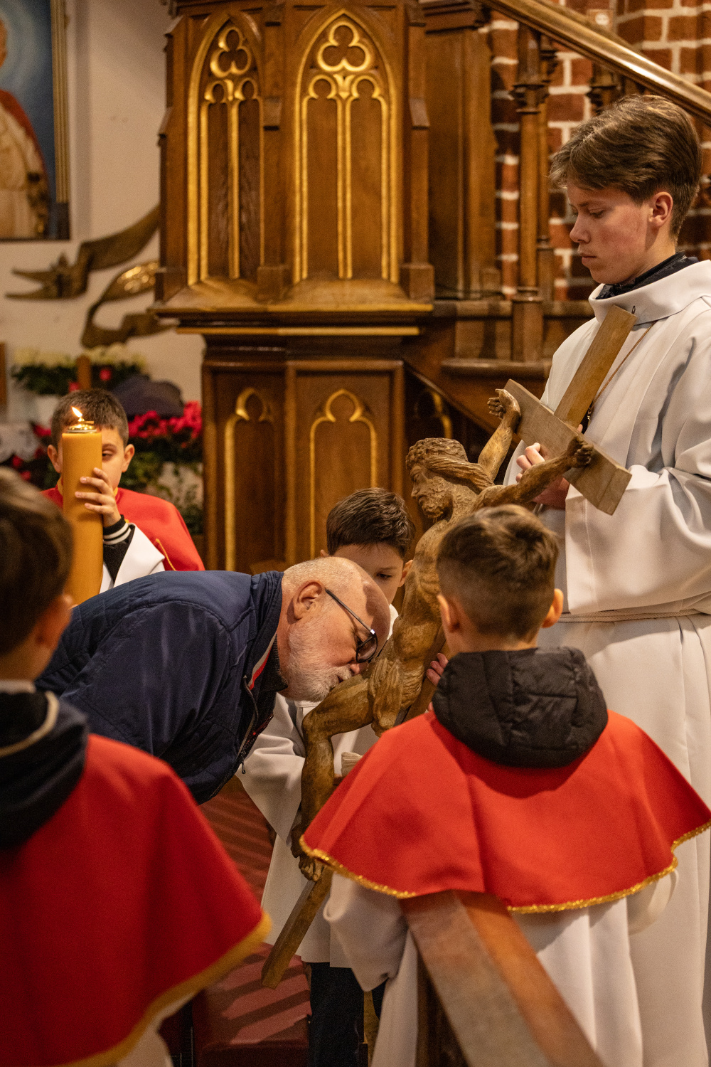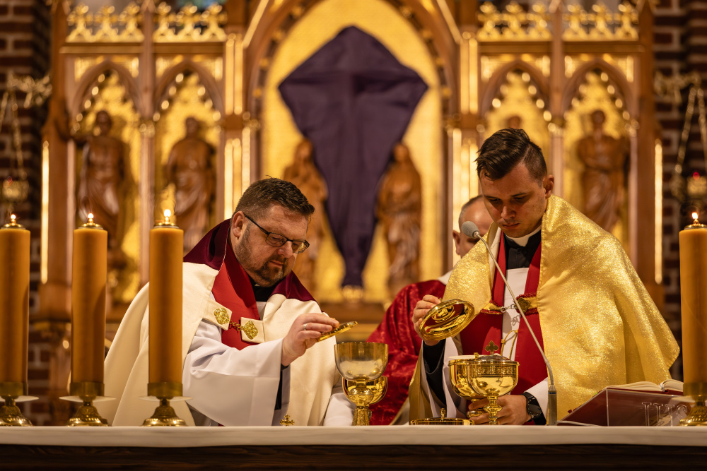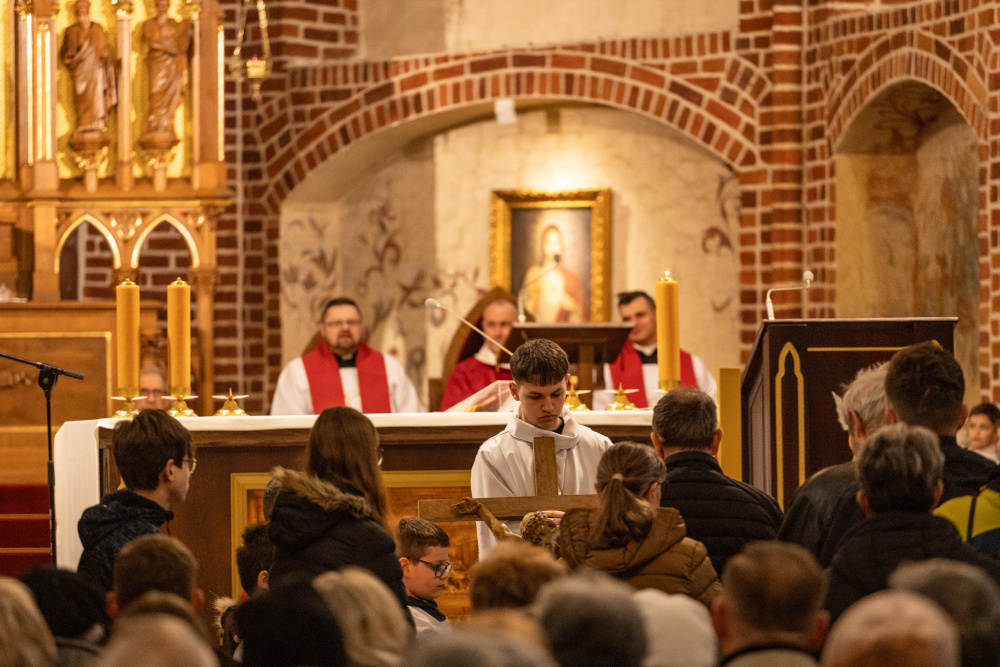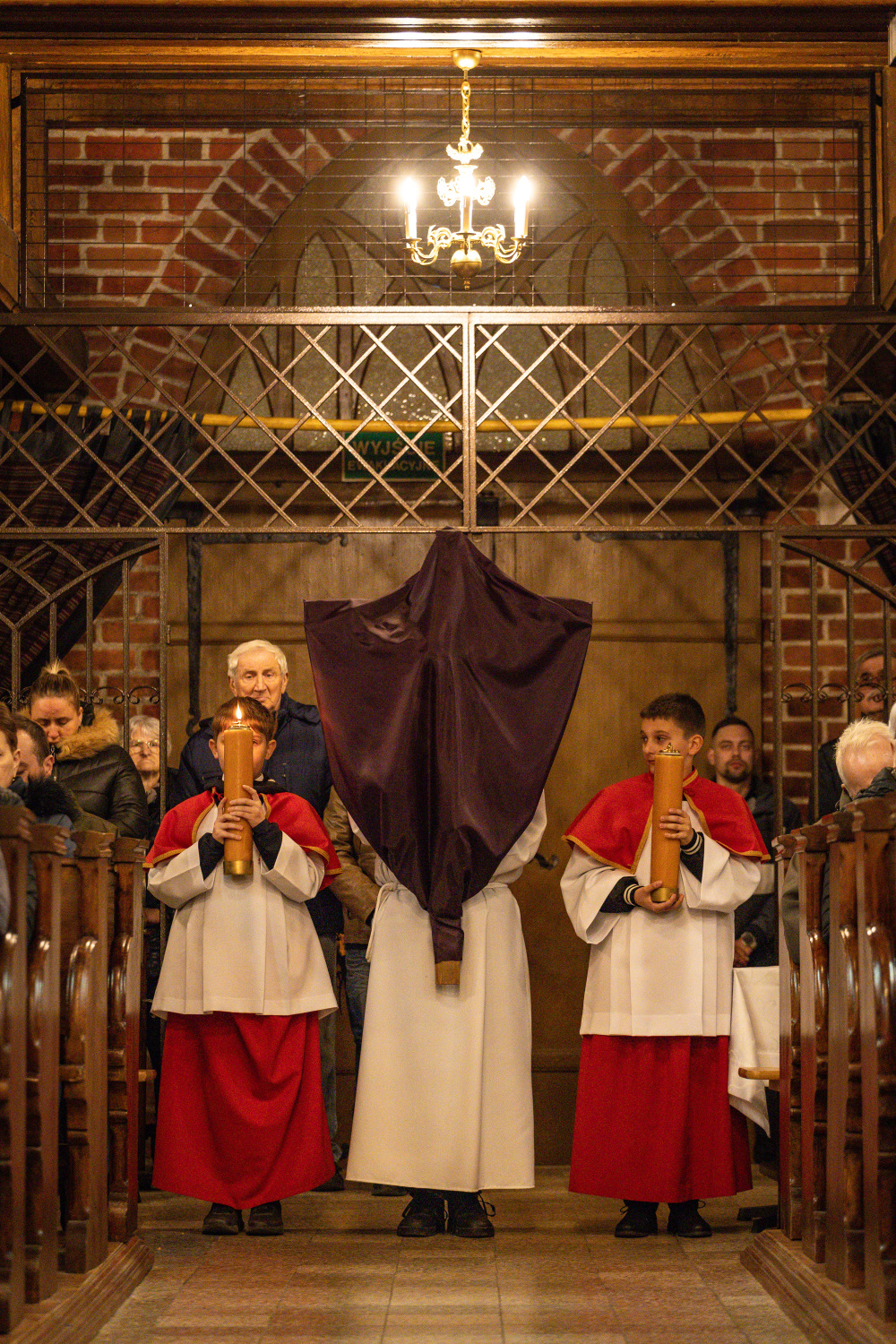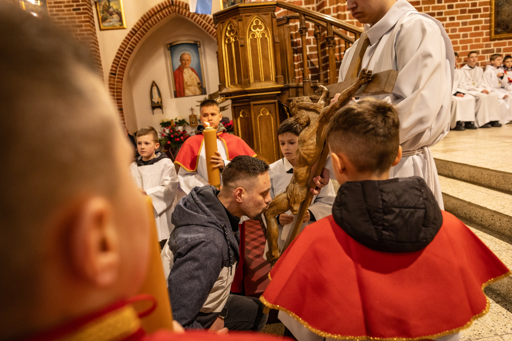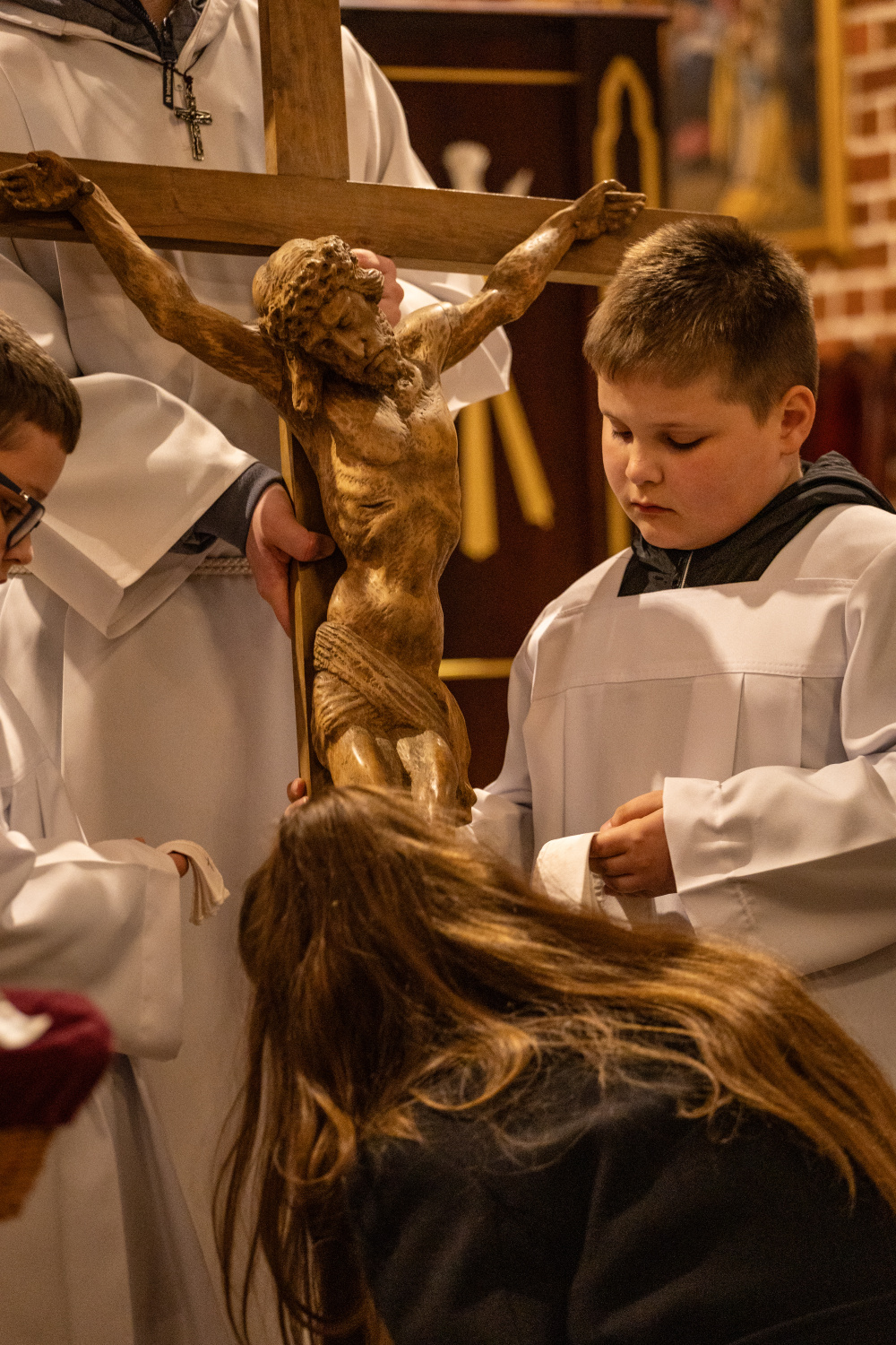 Ks. Proboszcz wraz z kapłanami i liturgiczną asystą, wszedł w ciszy do kościoła i padł twarzą przed ołtarzem. Po krótkiej modlitwie, bez znaku krzyża, rozpoczęła się liturgia. W centrum była Męka Chrystusa. Odczytana została Ewangelia św. Jana, w której wsłuchaliśmy się w opis Męki Chrystusa. Po homilii i uroczystej Modlitwie Powszechnej, w uroczystej procesji, wniesiony został krzyż, który ks. Proboszcz odsłaniał, śpiewając trzykrotnie: „Oto drzewo Krzyża, na którym zawisło Zbawienie świata”. I odpowiadał cały kościół, chcący wejść w tę tajemnicę Męki: „Pójdźmy z pokłonem”. Tym samym rozpoczęła się adoracja krzyża. Każdy obecny mógł podejść do ucałowania Krzyża. Po modlitwie „Ojcze Nasz”, udzielona została Komunia Święta, a po niej nastąpiło wystawienie Najświętszego Sakramentu, w monstrancji okrytej welonem (który symbolizuje całun, w jaki zawinięto Ciało Jezusa). Najświętszy Sakrament został przeniesiony w procesji do kaplicy, gdzie urządzony został symboliczny grób. Do godz. 01:00 w nocy trwała adoracja Chrystusa. Jako ostatni, przez godzinę, modlili się i czuwali młodzi, wraz z ks. Bohdanem.