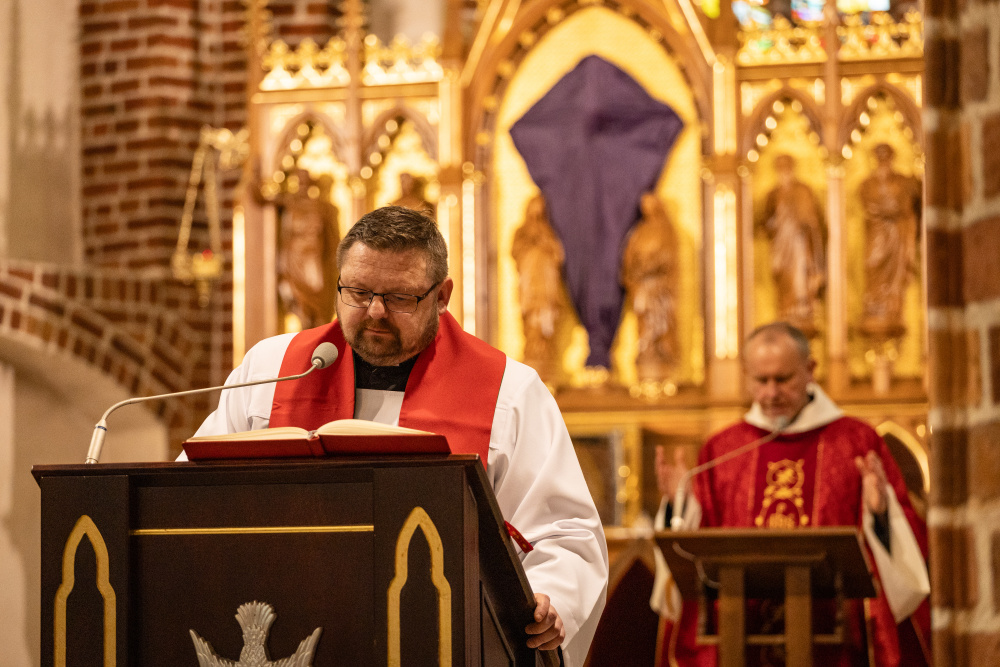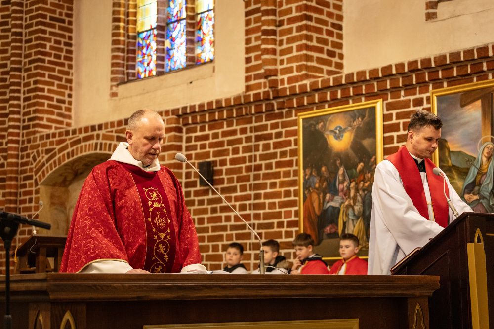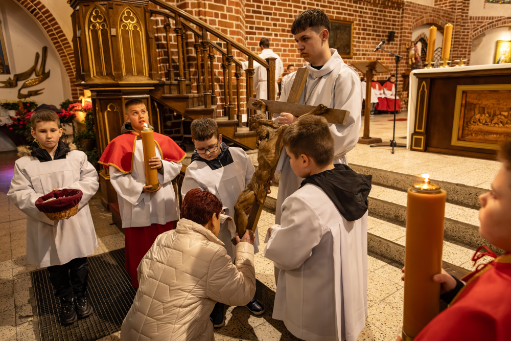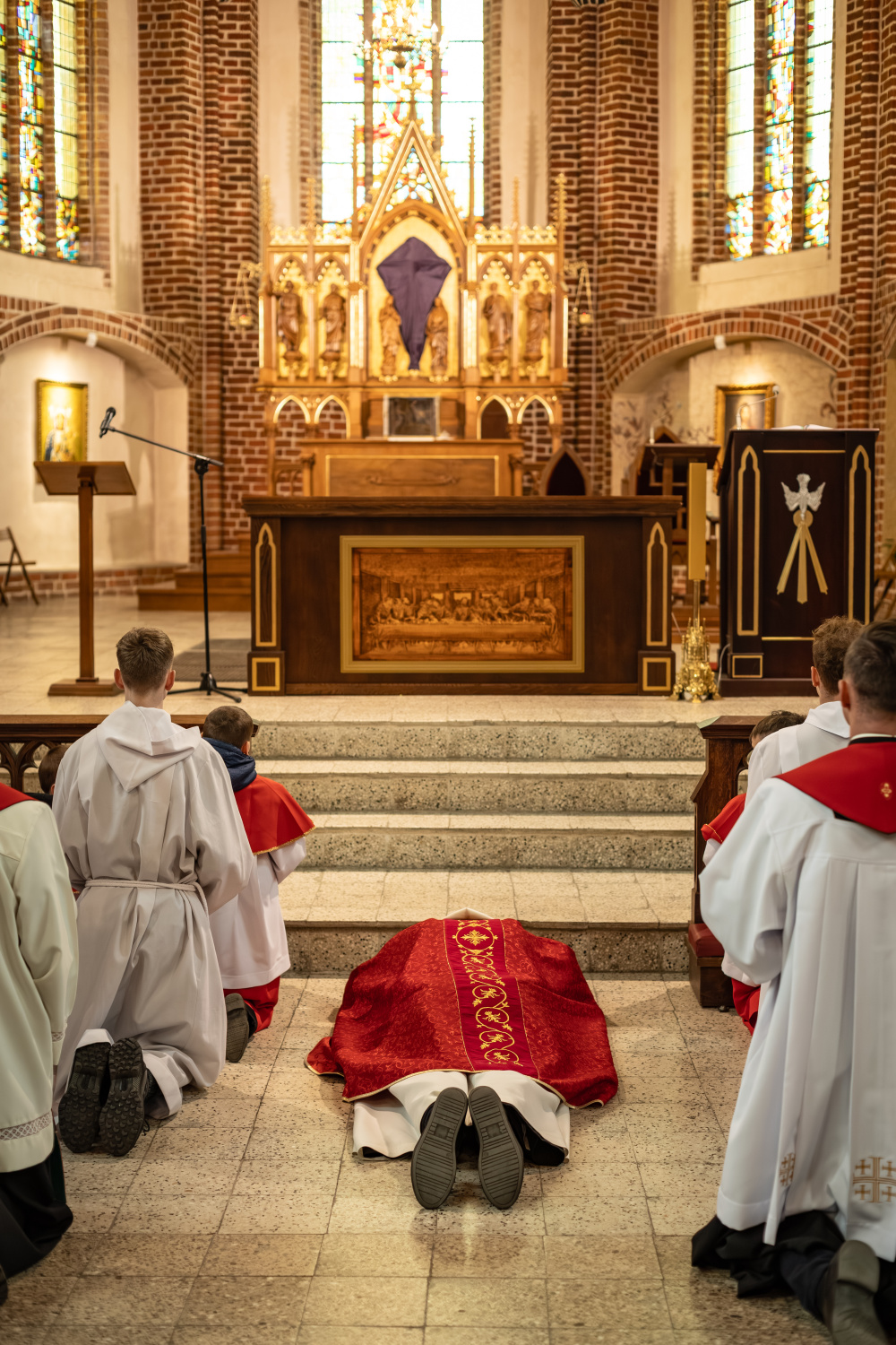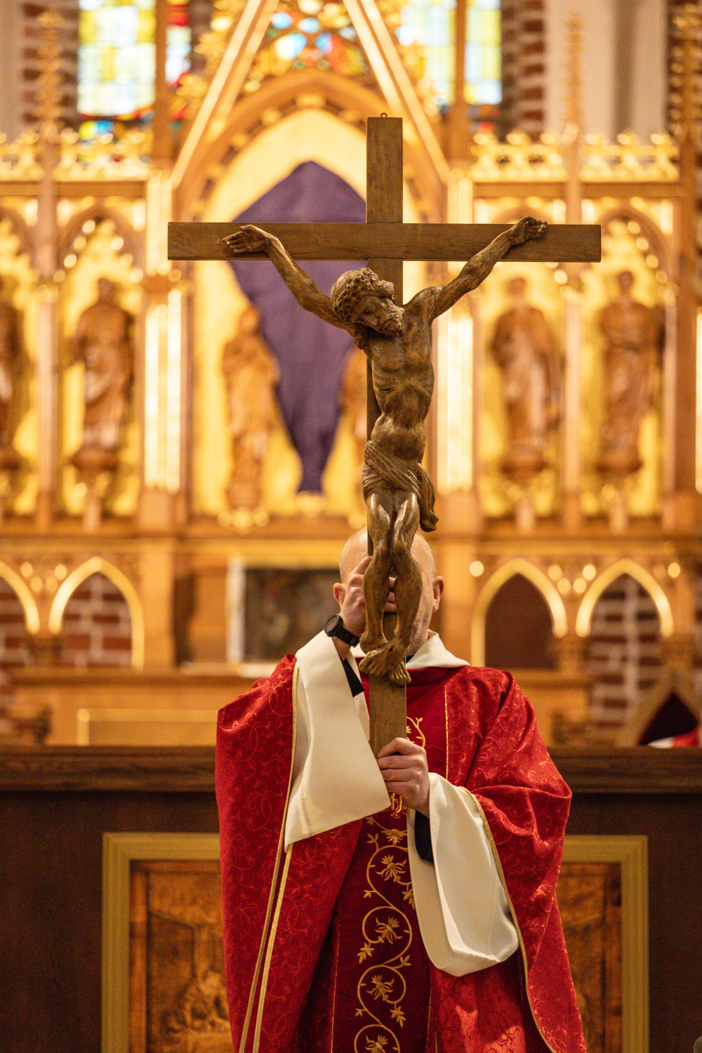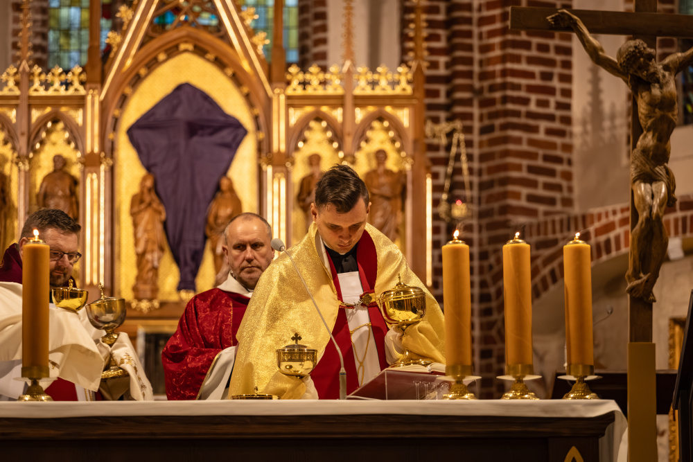 Ks. Proboszcz wraz z kapłanami i liturgiczną asystą, wszedł w ciszy do kościoła i padł twarzą przed ołtarzem. Po krótkiej modlitwie, bez znaku krzyża, rozpoczęła się liturgia. W centrum była Męka Chrystusa. Odczytana została Ewangelia św. Jana, w której wsłuchaliśmy się w opis Męki Chrystusa. Po homilii i uroczystej Modlitwie Powszechnej, w uroczystej procesji, wniesiony został krzyż, który ks. Proboszcz odsłaniał, śpiewając trzykrotnie: „Oto drzewo Krzyża, na którym zawisło Zbawienie świata”. I odpowiadał cały kościół, chcący wejść w tę tajemnicę Męki: „Pójdźmy z pokłonem”. Tym samym rozpoczęła się adoracja krzyża. Każdy obecny mógł podejść do ucałowania Krzyża. Po modlitwie „Ojcze Nasz”, udzielona została Komunia Święta, a po niej nastąpiło wystawienie Najświętszego Sakramentu, w monstrancji okrytej welonem (który symbolizuje całun, w jaki zawinięto Ciało Jezusa). Najświętszy Sakrament został przeniesiony w procesji do kaplicy, gdzie urządzony został symboliczny grób. Do godz. 01:00 w nocy trwała adoracja Chrystusa. Jako ostatni, przez godzinę, modlili się i czuwali młodzi, wraz z ks. Bohdanem.
