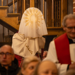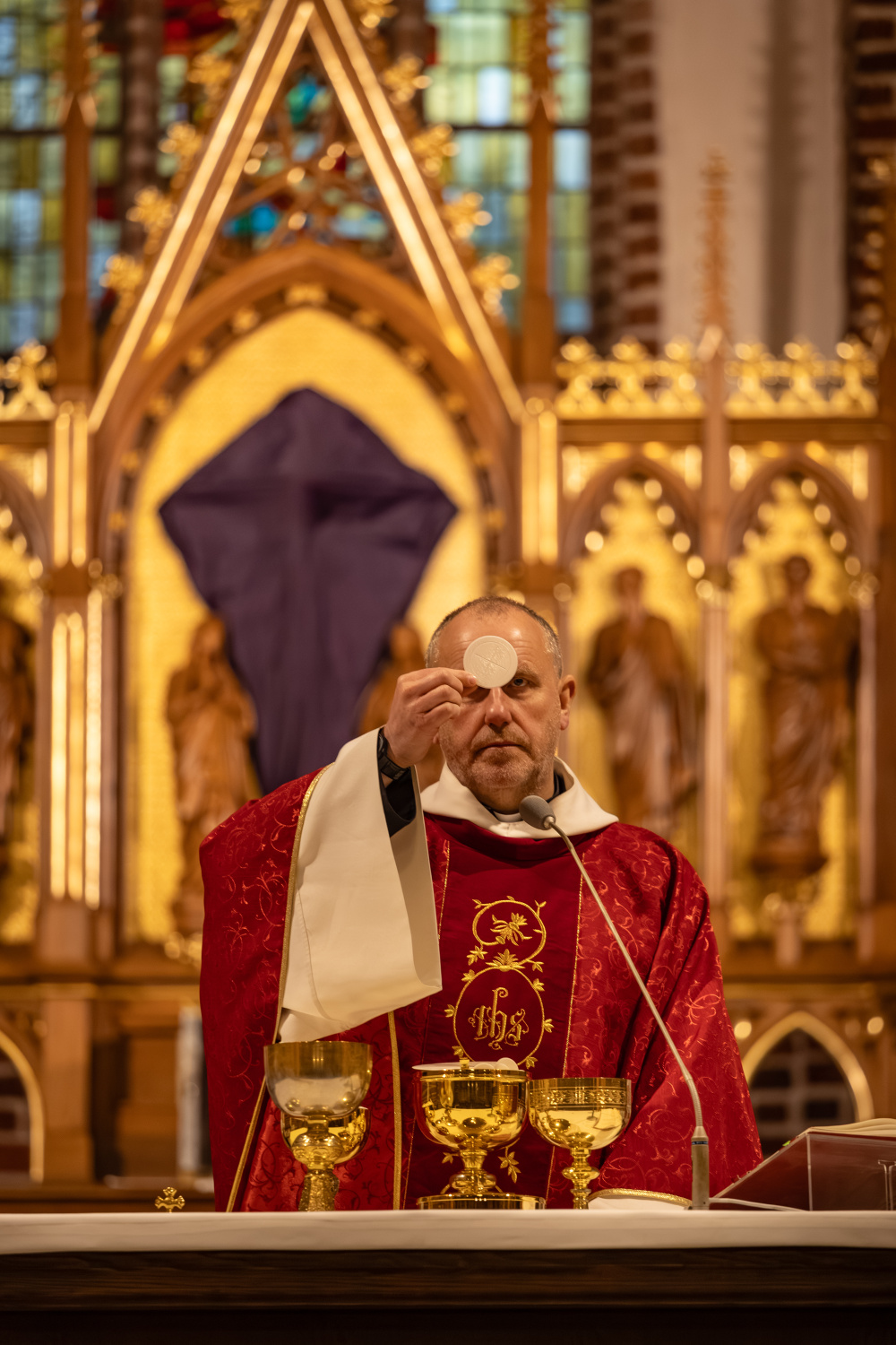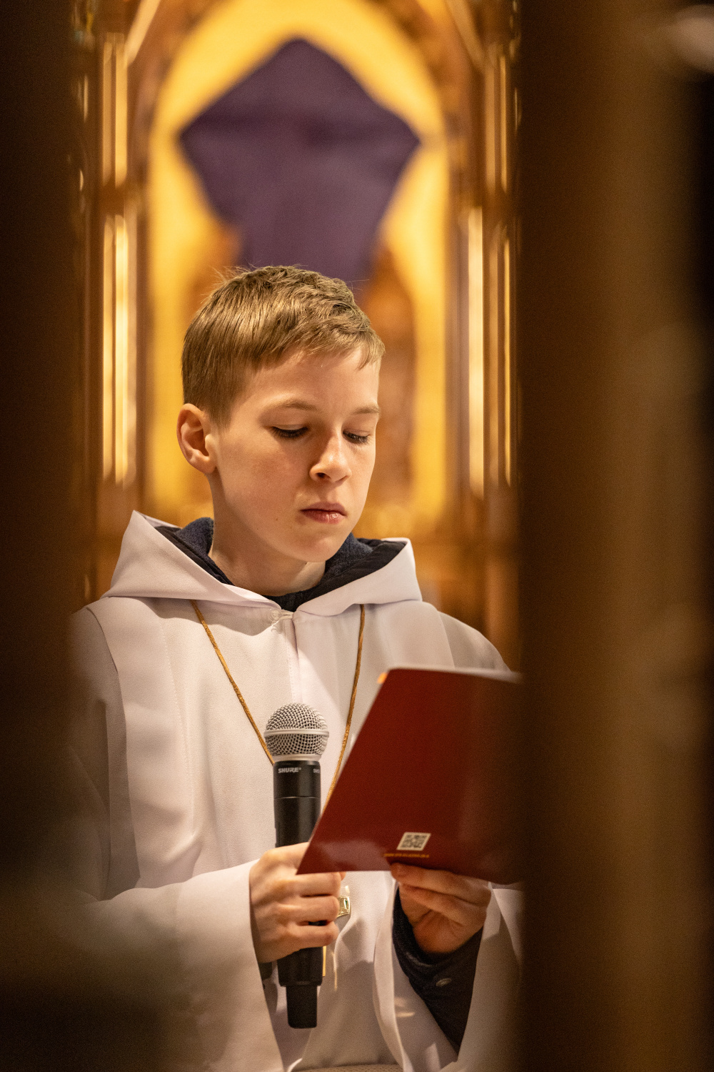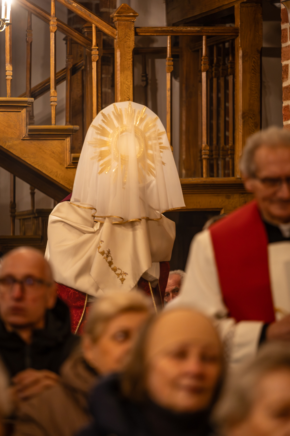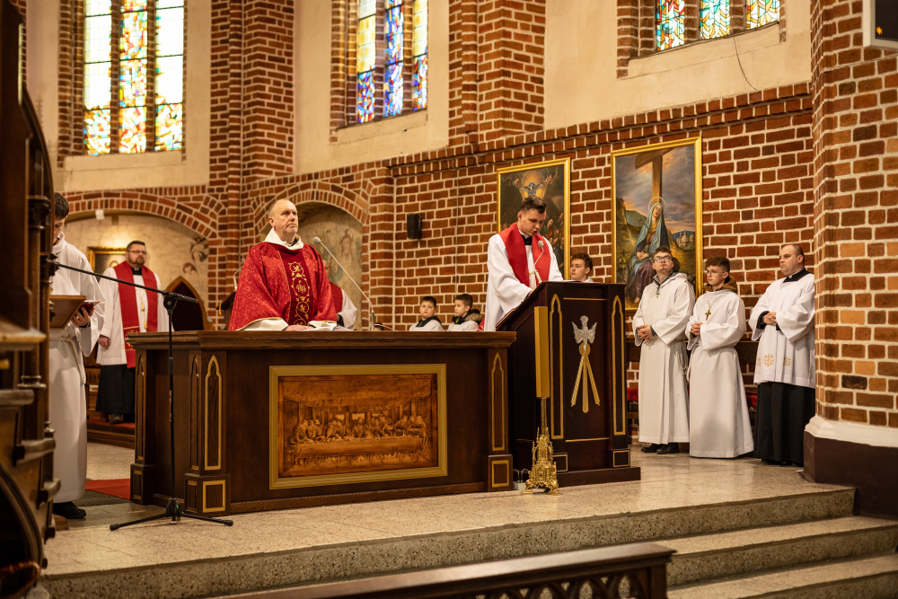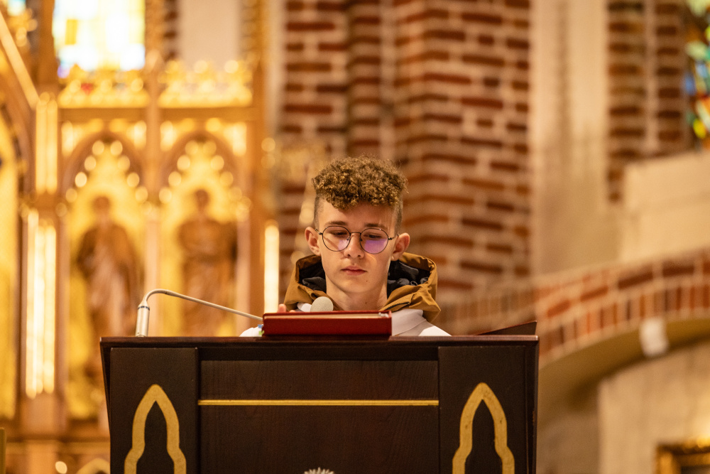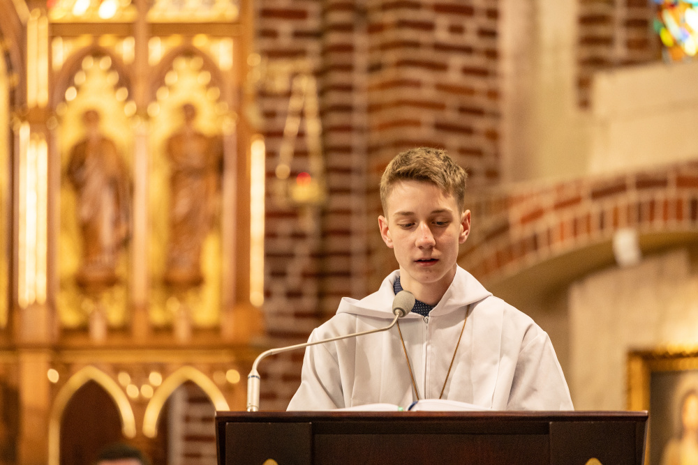 Ks. Proboszcz wraz z kapłanami i liturgiczną asystą, wszedł w ciszy do kościoła i padł twarzą przed ołtarzem. Po krótkiej modlitwie, bez znaku krzyża, rozpoczęła się liturgia. W centrum była Męka Chrystusa. Odczytana została Ewangelia św. Jana, w której wsłuchaliśmy się w opis Męki Chrystusa. Po homilii i uroczystej Modlitwie Powszechnej, w uroczystej procesji, wniesiony został krzyż, który ks. Proboszcz odsłaniał, śpiewając trzykrotnie: „Oto drzewo Krzyża, na którym zawisło Zbawienie świata”. I odpowiadał cały kościół, chcący wejść w tę tajemnicę Męki: „Pójdźmy z pokłonem”. Tym samym rozpoczęła się adoracja krzyża. Każdy obecny mógł podejść do ucałowania Krzyża. Po modlitwie „Ojcze Nasz”, udzielona została Komunia Święta, a po niej nastąpiło wystawienie Najświętszego Sakramentu, w monstrancji okrytej welonem (który symbolizuje całun, w jaki zawinięto Ciało Jezusa). Najświętszy Sakrament został przeniesiony w procesji do kaplicy, gdzie urządzony został symboliczny grób. Do godz. 01:00 w nocy trwała adoracja Chrystusa. Jako ostatni, przez godzinę, modlili się i czuwali młodzi, wraz z ks. Bohdanem.