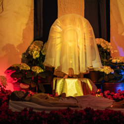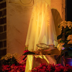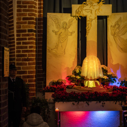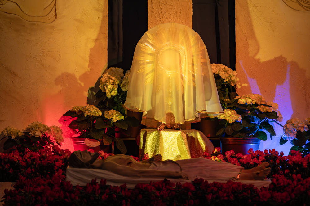 Przepiękny Grób Pański przygotowali p. Waldemar Ślusarczyk (dekoracja) oraz p. Krystyna Osolińska (kompozycje kwietne).