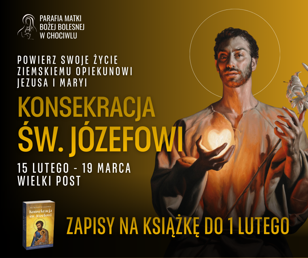 Kochani Parafianie i przyjaciele naszej Parafii: nadszedł CZAS... by duchowo zaprzyjaźnić się ze św. Józefem i powierzyć swoje życie, rodziny, naszą ukochaną, chociwelską Parafię potężnemu Orędownikowi i Patronowi Kościoła - św. Józefowi... Sprawa jest poważna. Tu chodzi o nasze zbawienie wieczne!!! Gorąco zachęcamy i zapraszamy do odbycia 33-DNIOWYCH REKOLEKCJI "Konsekracji św. Józefowi" w dniach 15 lutego - 19 marca 2026 roku.