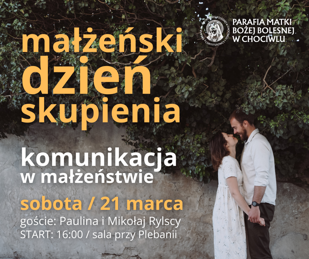 Rozpoczniemy go konferencją KOMUNIKACJA W MAŁŻEŃSTWIE o godz. 16.00, którą poprowadzą Paulina i Mikołaj Rylscy. W programie: warsztaty, dyskusja, wspólna modlitwa i EUCHARYSTIA. Zakończymy AGAPĄ ok. godz. 20.00. Zgłoszenia: ks. Zbigniew, proboszcz, tel.: 509 477 763