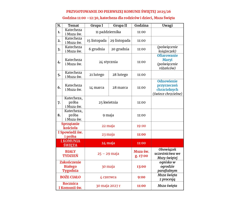 Prosimy rodziców o zapoznanie się z terminami Mszy Świętej, katechez, spotkań przygotowujących dzieci do przyjęcia Pierwszej Komunii Świętej.